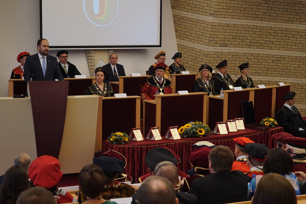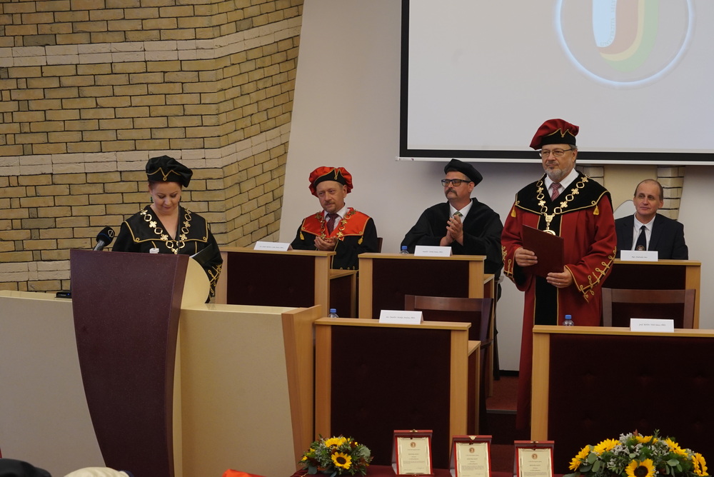 A továbbiakban Róbert Zsembera, a Szlovák Oktatásügyi Minisztérium felsőoktatásért felelős államtitkára, Nacsa Lőrinc, a Miniszterelnökség nemzetpolitikáért felelős államtitkára és Vladimír Hiadlovský, a Szlovák Rektori Konferencia elnöke méltatták intézményünket, hangsúlyozva annak a szlovákiai felsőoktatásban és a Kárpát-medence térségében betöltött különleges helyét és szerepét. Hivatalába való beiktatatása alkalmából elismerő szavakkal illették az egyetem rektorát, sok sikert kívánva a minőségi oktatás megvalósításához. Keszegh Béla, Komárom város polgármestere főként az egyetem új és jelenlegi hallgatóihoz intézte szavait, biztosítva őket a város támogatásáról.