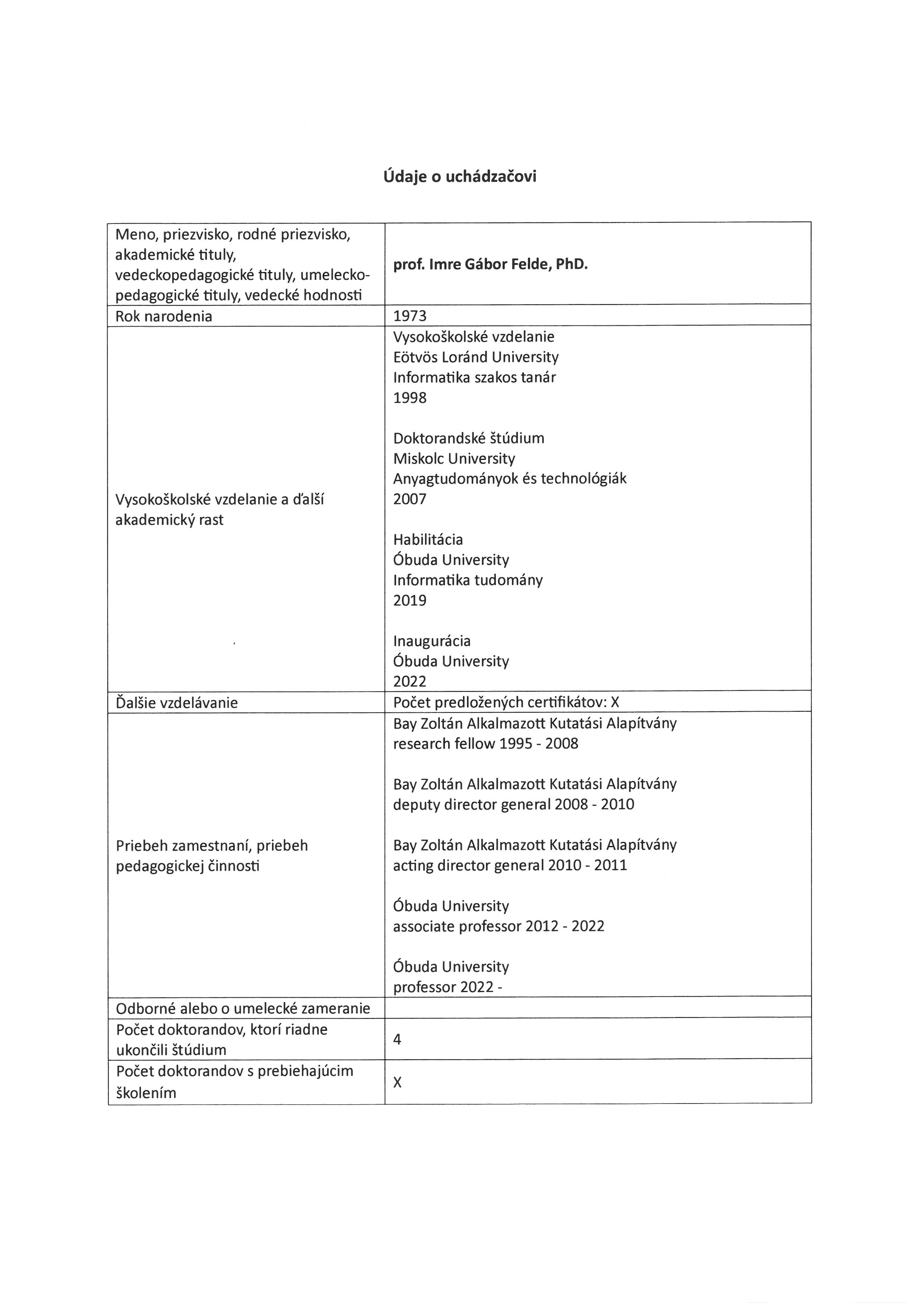 Uchádzač č. 1 – prof. Imre Gábor Felde, PhD.